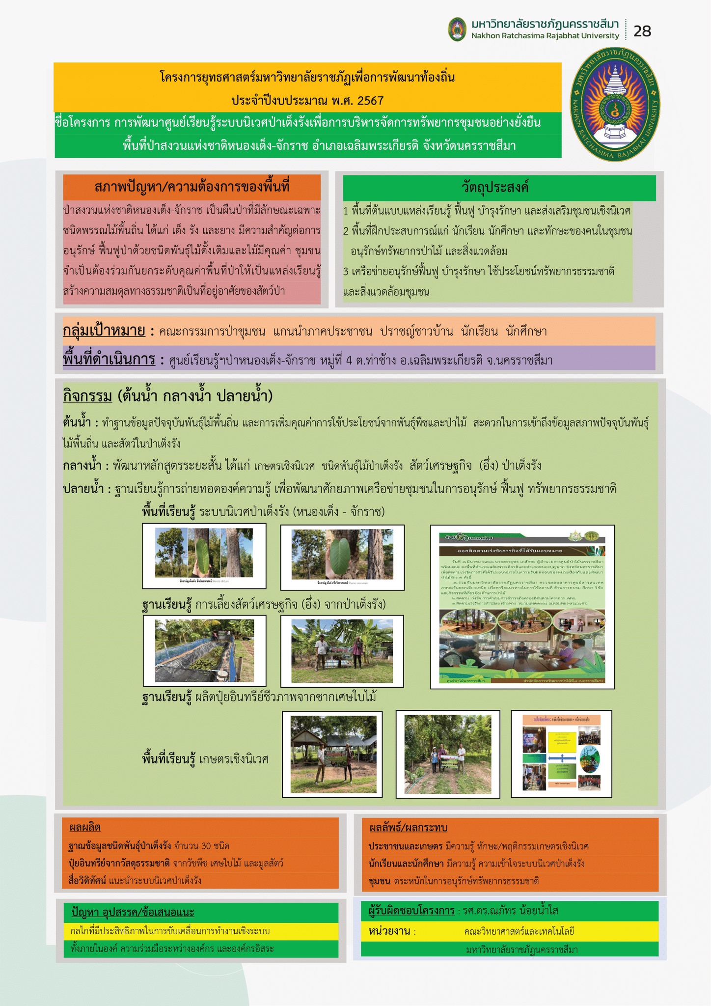 7. การพัฒนาศูนย์เรียนรู้ระบบนิเวศป่าเต็งรังเพื่อการบริหารจัดการทรัพยากรชุมชนอย่างยั่งยืน พื้นที่ป่าสงวนแห่งชาติหนองเต็ง-จักราช อําเภอเฉลิมพระเกียรติจังหวัดนครราชสีมา โครงการนี้มีจุดเน้นคือการอนุรักษ์และฟื้นฟูระบบนิเวศป่าเต็งรัง โดยมีการทำกิจกรรมที่เกี่ยวข้องกับการบำรุงรักษา และฟื้นฟูป่าด้วยชนิดพันธุ์ไม้ดั้งเดิม ซึ่งสอดคล้องกับเป้าหมายในการจัดการป่าไม้อย่างยั่งยืนและยุติการสูญเสียความหลากหลายทางชีวภาพ