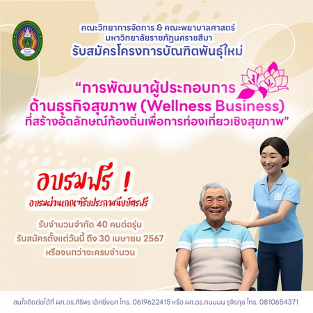 หลักสูตรการพัฒนาผู้ประกอบการ ด้านธุรกิจสุขภาพ (Wellness Business) เป็นหลักสูตรระยะสั้นที่เปิดโอกาสให้ประชาชนทั่วไป บุคลากรในพื้นที่ และผู้สนใจประกอบอาชีพได้เรียนรู้ทักษะด้านสุขภาพและการบริการเชิงท่องเที่ยว โดยบูรณาการองค์ความรู้จากภาคการศึกษาและสถานประกอบการในจังหวัดนครราชสีมา มีระยะเวลาอบรม 4 เดือน เพื่อพัฒนาความรู้และสมรรถนะในอาชีพ เช่น การนวดเพื่อสุขภาพ การใช้สมุนไพรท้องถิ่น การสื่อสารการตลาดดิจิทัล และการดูแลสุขภาพผู้สูงอายุ