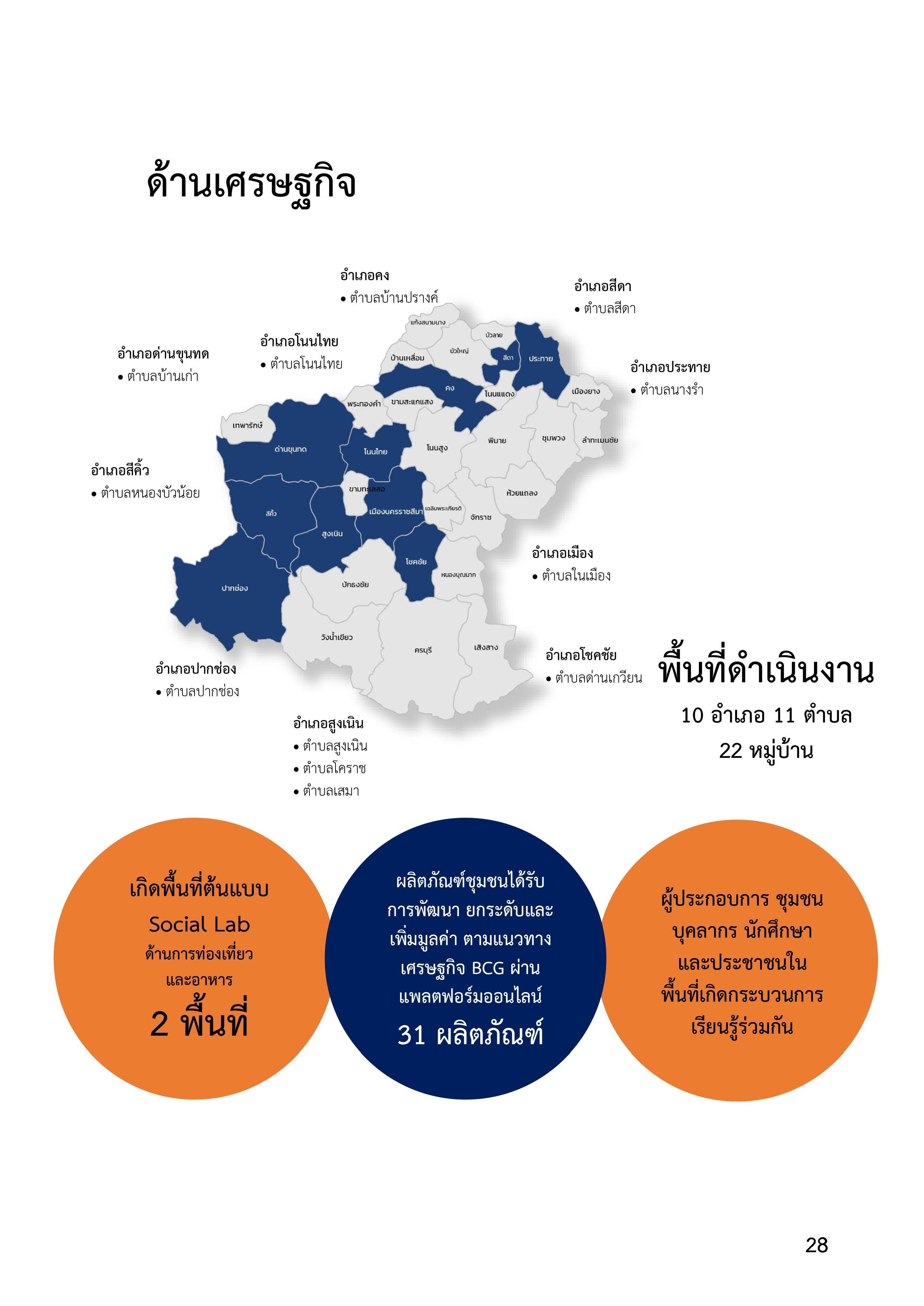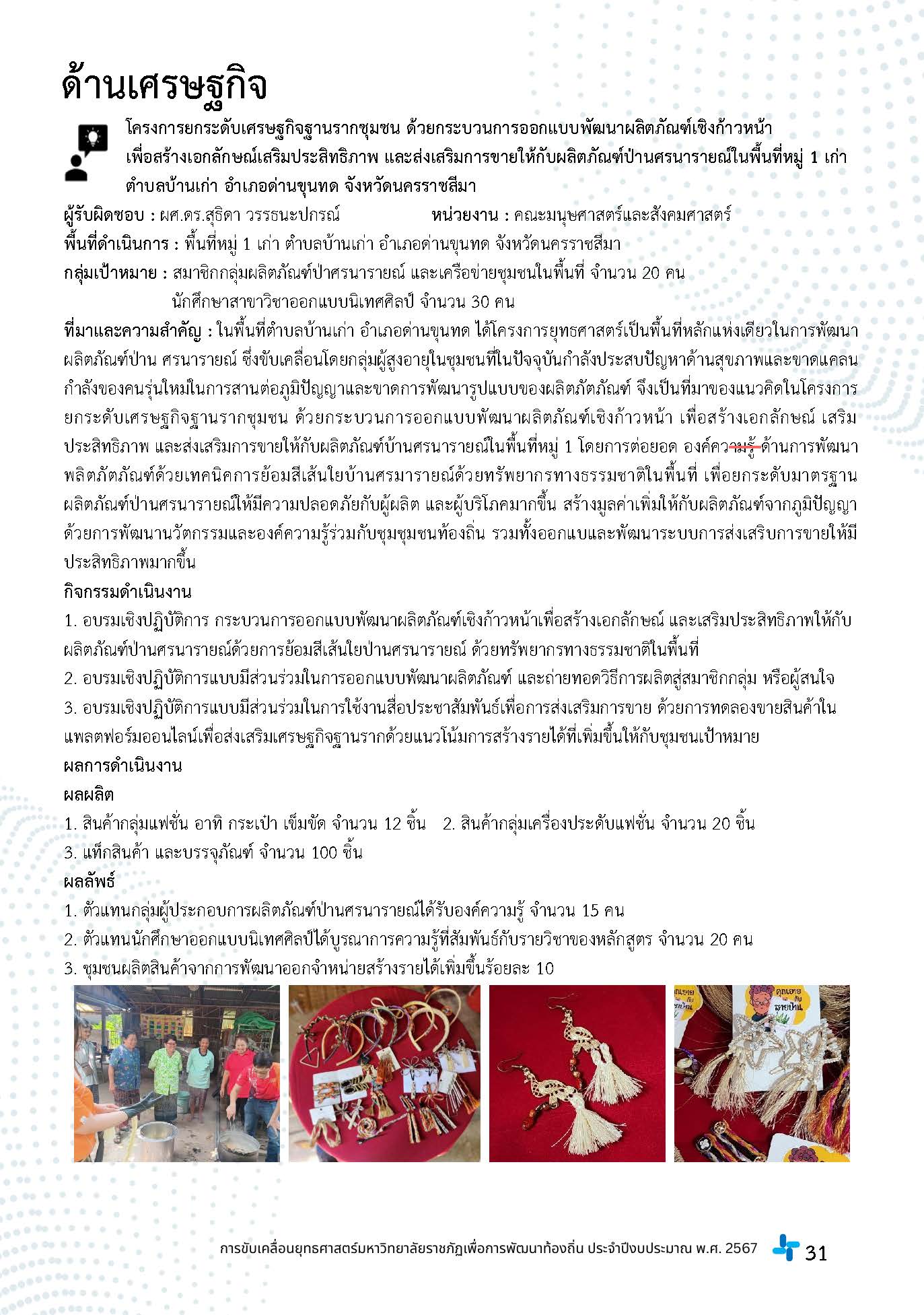 | 31 | โครงการยกระดับเศรษฐกิจฐานรากชุมชน ด้วยกระบวนการออกแบบพัฒนาผลิตภัณฑ์เชิงก้าวหน้าเพื่อสร้างเอกลักษณ์เสริมประสิทธิภาพ และส่งเสริมการขายให้กับผลิตภัณฑ์ป่านศรนารายณ์ในพื้นที่หมู่ 1 เก่าตำบลบ้านเก่า อำเภอด่านขุนทด จังหวัดนครราชสีมา | ผศ.ดร.สุธิดา วรรธนะปกรณ์ | คณะมนุษยศาสตร์และสังคมศาสตร์ | พื้นที่หมู่ 1 เก่า ตำบลบ้านเก่า อำเภอด่านขุนทด จังหวัดนครราชสีมา/สมาชิกกลุ่มผลิตภัณฑ์ป่าศรนารายณ์ และเครือข่ายชุมชนในพื้นที่ จำนวน 20 คน นักศึกษาสาขาวิชาออกแบบนิเทศศิลป์ จำนวน 30 คน | ผลผลิต |