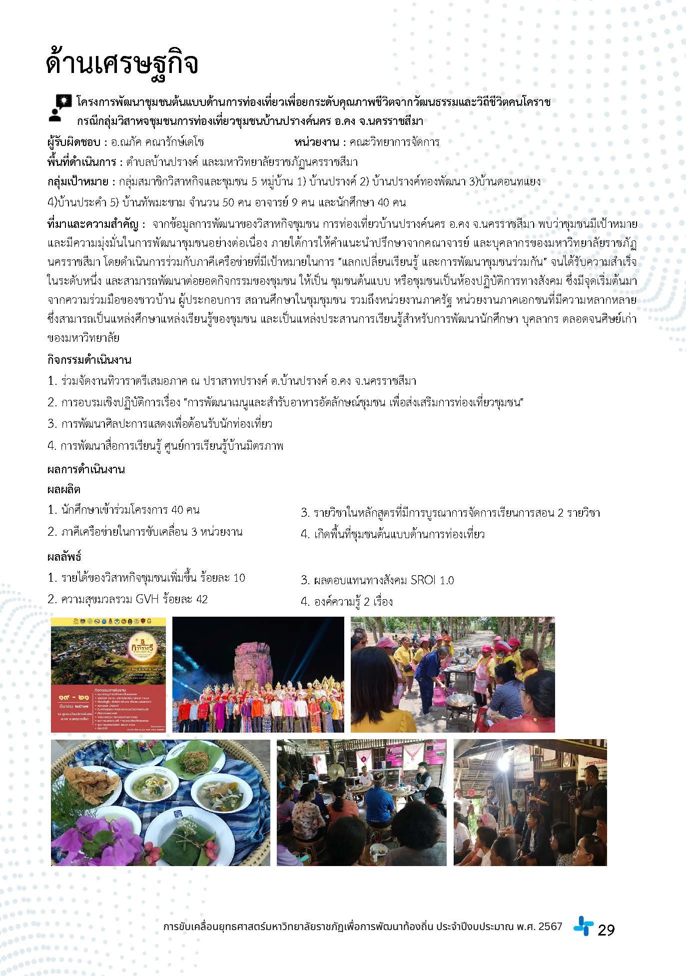 | 29 | โครงการพัฒนาชุมชนต้นแบบด้านการท่องเที่ยว เพื่อยกระดับคุณภาพชีวิตจากวัฒนธรรมและวิถีชีวิตคนโคราช กรณีกลุ่มวิสาหกิจชุมชนการท่องเที่ยวชุมชนบ้านปรางค์นคร อ.คง จ.นครราชสีมา | อ.ณภัค คณารักษ์เดโช | คณะวิทยาการจัดการ | ต.บ้านปรางค์ อ.คง จ.นครราชสีมา และมหาวิทยาลัยราชภัฏนครราชสีมา/ กลุ่มสมาชิกวิสาหกิจและชุมชน 5 หมู่บ้าน 1) บ้านปรางค์ 2) บ้านปรางค์ทองพัฒนา 3) บ้านดอนทแยง 4) บ้านประคำ 5) บ้านทับมะขาม จำนวน 50 คน อาจารย์ 9 คน และ นักศึกษา 40 คน | ผลผลิต ผลลัพธ์ |