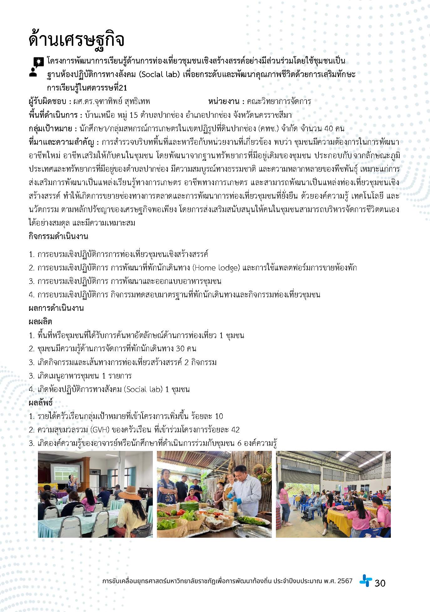 | 30 | โครงการพัฒนาการเรียนรู้ด้านการท่องเที่ยวชุมชนเชิงสร้างสรรค์อย่างมีส่วนร่วมโดยใช้ชุมชนเป็นฐานห้องปฏิบัติการทางสังคม (Social Lab) เพื่อยกระดับและพัฒนาคุณภาพชีวิตด้วยการเสริมทักษะการเรียนรู้ในศตวรรษที่ 21 | ผศ.ดร.จุฑาทิพย์ สุทธิเทพ | คณะวิทยาการจัดการ | บ้านเหนือ ต.ปากช่อง อ.ปากช่อง จ.นครราชสีมา/นักศึกษา/กลุ่มสหกรณ์การเกษตรในเขตปฏิรูปที่ดินปากช่อง (คทช.) จากัด จำนวน 40 คน | ผลผลิต 1. พื้นที่หรือชุมชนที่ได้รับการค้นหาอัตลักษณ์ด้านการท่องเที่ยว 1 ชุมชน 2. ชุมชนมีความรู้ด้านการจัดการที่พักนักเดินทาง 30 คน 3. เกิดกิจกรรมและเส้นทางการท่องเที่ยวสร้างสรรค์ 2 กิจกรรม 4. เกิดเมนูอาหารชุมชน 1 รายการ 5. เกิดห้องปฏิบัติการทางสังคม (Social lab) 1 ชุมชน ผลลัพธ์ 1. รายได้ครัวเรือนกลุ่มเป้าหมายที่เข้าโครงการเพิ่มขึ้น ร้อยละ 102. 2. ความสุขมวลรวม (GVH) ของครัวเรือน ที่เข้าร่วมโครงการร้อยละ 423. 3. เกิดองค์ความรู้ของอาจารย์หรือนักศึกษาที่ดำเนินการร่วมกับชุมชน 6 องค์ความรู้ |