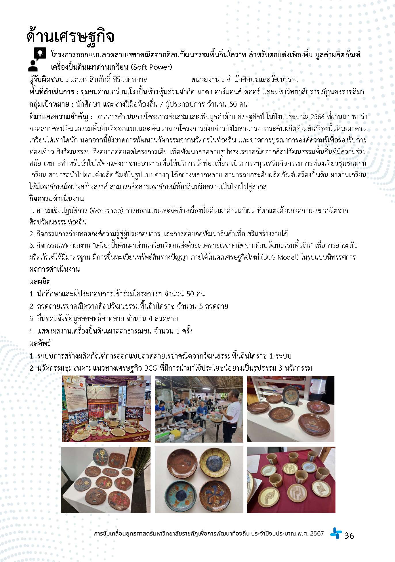 | 36 | โครงการออกแบบลวดลายเรขาคณิตจากศิลปวัฒนธรรมพื้นถิ่นโคราช สำหรับตกแต่งเพื่อเพิ่ม มูลค่าผลิตภัณฑ์เครื่องปั้นดินเผาด่านเกวียน (Soft Power) | ผศ.ดร.สืบศักดิ์ สิริมงคลกาล | สำนักศิลปะและวัฒนธรรม | ชุมชนด่านเกวียน,โรงปั้นห้างหุ้นส่วนจำกัด มาตา อาร์แอนด์เดคอร์ และมหาวิทยาลัยราชภัฏนครราชสีมากลุ่มเป้าหมาย : นักศึกษา และช่างฝีมือท้องถิ่น / ผู้ประกอบการ จำนวน 50 คน | ผลผลิต 1. นักศึกษาและผู้ประกอบการเข้าร่วมโครงการฯ จำนวน 50 คน 2. ลวดลายเรขาคณิตจากศิลปวัฒนธรรมพื้นถิ่นโคราช จำนวน 5 ลวดลาย 3. ยื่นจดแจ้งข้อมูลลิขสิทธิ์ลวดลาย จำนวน 4 ลวดลาย 4. แสดงผลงานเครื่องปั้นดินเผาสู่สาธารณชน จำนวน 1 ครั้ง ผลลัพธ์ 1. ระบบการสร้างผลิตภัณฑ์การออกแบบลวดลายเรขาคณิตจากวัฒนธรรมพื้นถิ่นโคราช 1 ระบบ 2. นวัตกรรมชุมชนตามแนวทางเศรษฐกิจ BCG ที่มีการนามาใช้ประโยชน์อย่างเป็นรูปธรรม 3 นวัตกรรม |