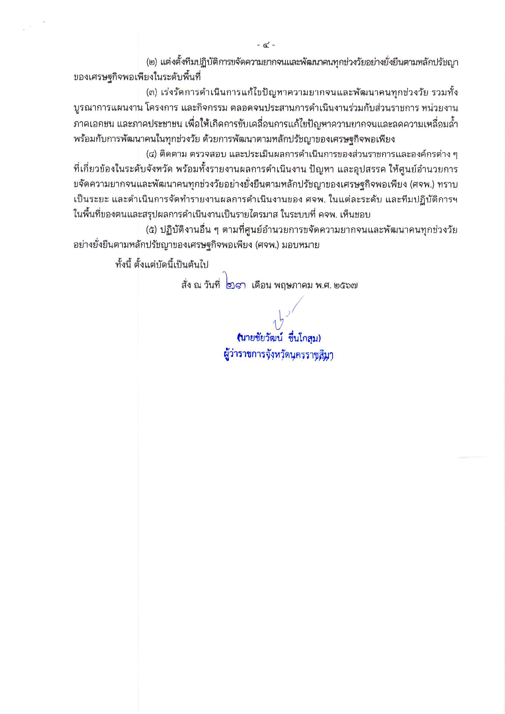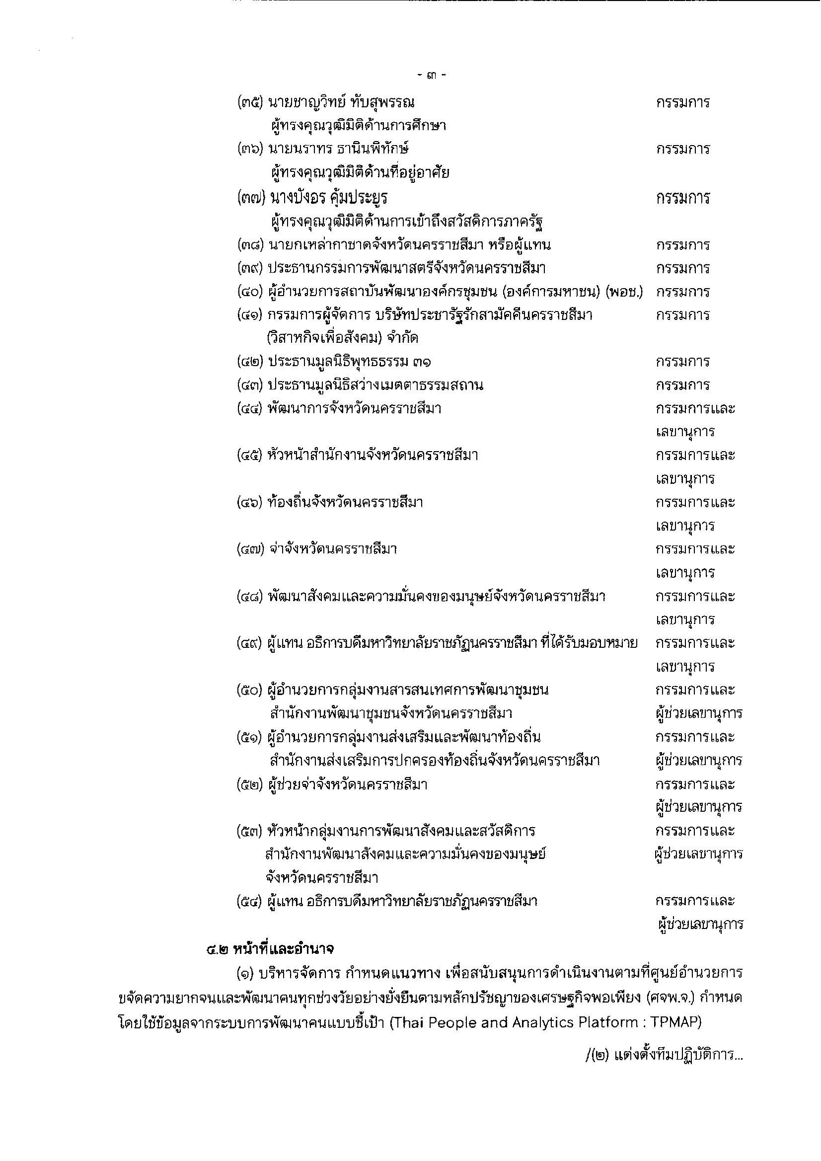 แต่งตั้งตาม คำสั่งจังหวัดนครราชสีมา ที่ 7181/2567 ลงวันที่ 18 กันยายน พ.ศ. 2567 เรื่อง แก้ไขคำสั่งจัดตั้งศูนย์อำนวยการขจัดความยากจนและพัฒนาคนทุกช่วงวัยอย่างยั่งยืน ตามหลักปรัชญาของเศรษฐกิจพอเพียงจังหวัดนครราชสีมา (ศจพ.จ.นม.)