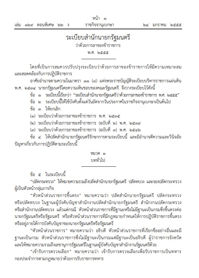 - ระเบียบสำนักนายกรัฐมนตรี ว่าด้วย การลาของข้าราชการ พ.ศ. 2555
