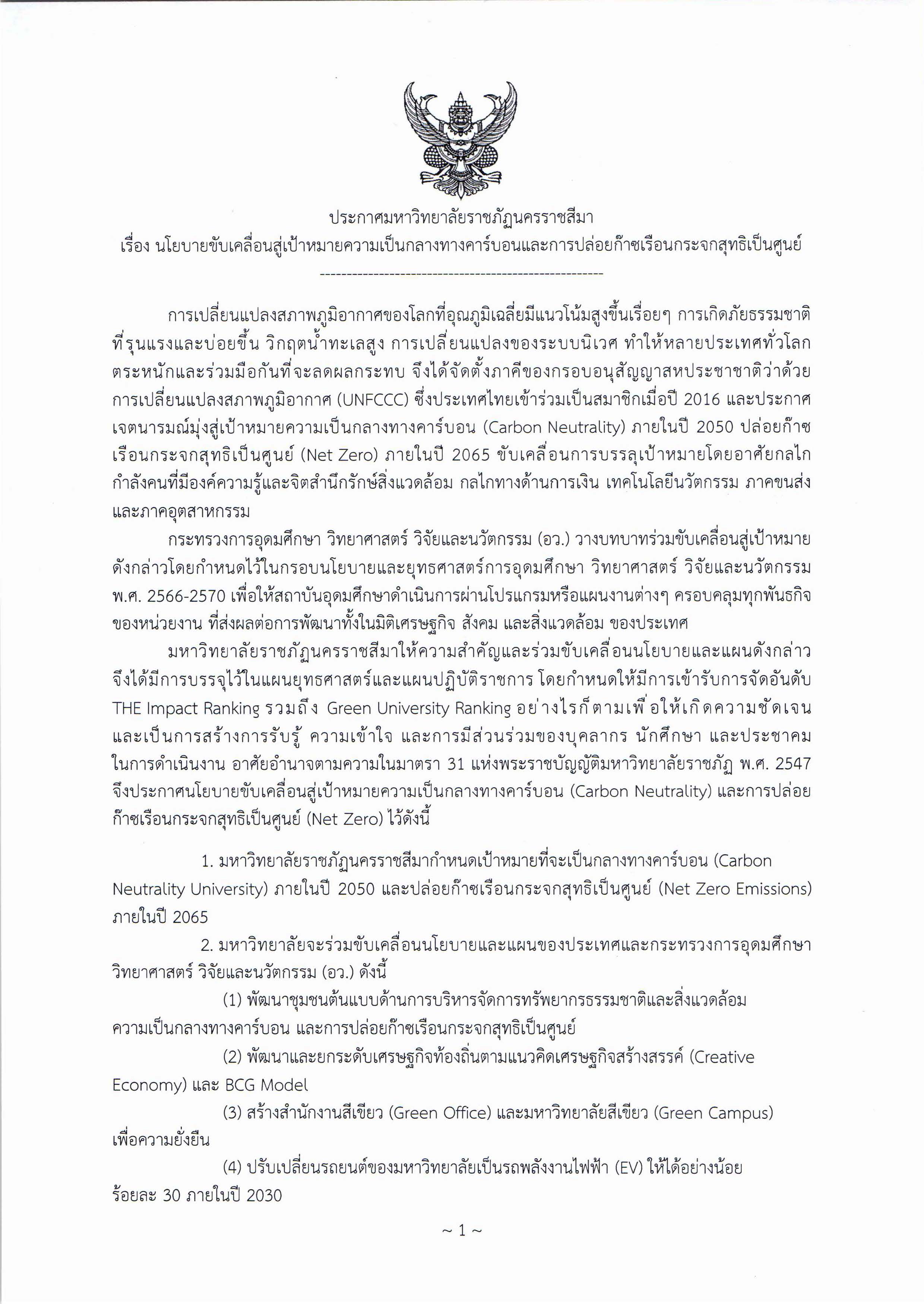 มหาวิทยาลัยราชภัฏนครราชสีมากำหนดเป้าหมายที่จะเป็นสถาบันการเป็นกลางทางการคาร์บอน (Carbon Neutrality University) ภายในปี 2050 และปล่อยก๊าซเรือนกระจกสุทธิเป็นศูนย์ (Net Zero Emissions) ภายในปี 2065