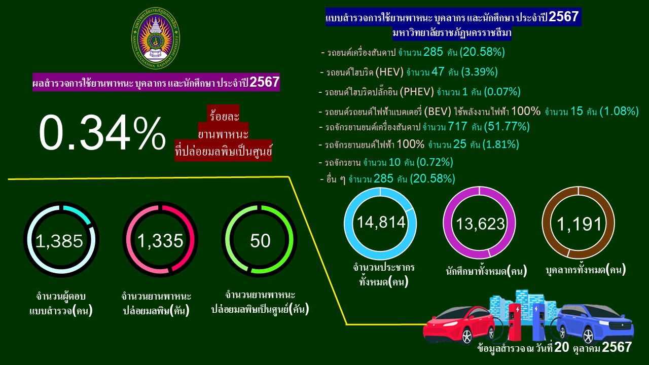 และมีการสำรวจการใช้ยานพาหนะไฟฟ้า (EV) ของนักศึกษาและบุคลากรภายในมหาวิทยาลัยราชภัฏนครราชสีมา เพื่อใช้เป็นฐานข้อมูลในการผลักดันการใช้ยานพาหนะที่เป็นมิตรต่อสิ่งแวดล้อม