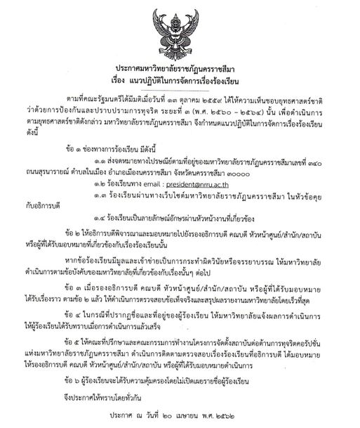 มร.นม. ได้ออก ประกาศมหาวิทยาลัยราชภัฏนครราชสีมา เรื่อง แนวปฏิบัติในการจัดการเรื่องร้องเรียน เพื่อเป็นกรอบแนวทางในการรับเรื่อง รวบรวมข้อเท็จจริง และดำเนินการตรวจสอบอย่างเป็นระบบ โดยระบุช่องทางการร้องเรียนอย่างชัดเจน ได้แก่